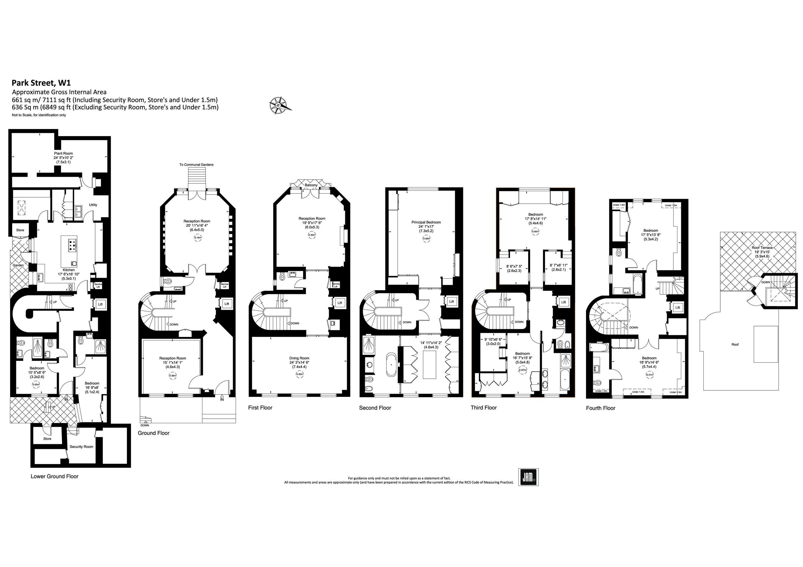 A Stunning and architecturally appealing freehold townhouse of 6,949 square feet situated at the favoured northern end of Park Street whereby only a small number of houses back on to the hidden Green Street gardens. Brick fronted with intricate stucco detailing, the house spans 3 windows across allowing an abundance of natural light throughout. Generously proportioned and designed by revered Dutch designer Marcel Wanders, the house offers well-balanced accommodation throughout including a large study and separate family room at ground floor level, the latter of which offers direct access to the Green Street Gardens. Formal reception rooms are found on the first floor with an elegant drawing room overlooking the gardens and a substantial dining room at the front of the house, sufficiently large enough to comfortably seat 15 guests. The Master bedroom Suite occupies the entire second floor of the house with a beautifully appointed dressing room and luxurious "spa' bathroom clad in opulent marble and underfloor heating throughout. The third floor is the childrens' floor and has been creatively designed with fun in mind. Whilst it has been uniquely appointed with specialist joinery, it could easily be refitted to create two more conventional bedroom suites as desired. Two large guest suites can be found at the top (fourth floor) of the house, providing easy access to the roof terrace which offers far reaching views over both the gardens and the roof tops of Mayfair. At lower ground floor level there is an efficient family kitchen with industrial grade extraction and Miele appliances. With ancillary storage and utility rooms, the house also allows for two staff bedroom suites and a "dumb waiter' to serve